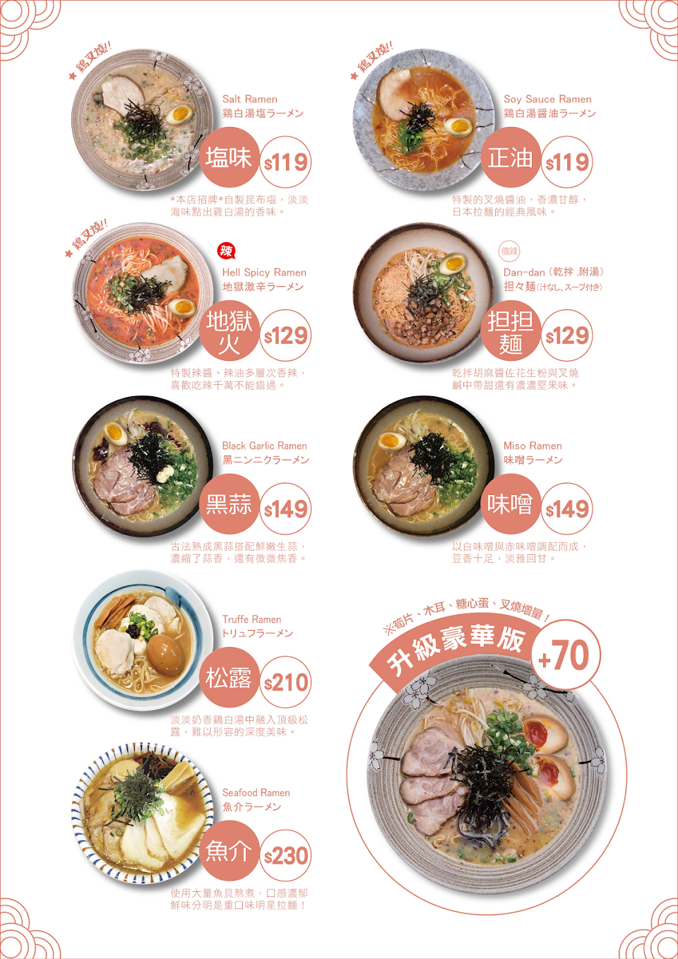 真的很好吃! 個人覺得喜歡吃辣的人可以試試他們的地獄火 是可以調辣度的!建議先從小辣試試看 魚介也不錯 湯頭很濃郁 服務 內用 餐點類型 晚餐 平均每人消費金額 $1-200