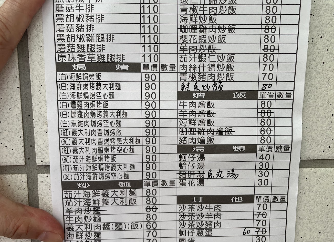 牛肉燴飯80/海鮮燴飯80/茄汁海鮮焗烤義大利麵90/海鮮炒麵70