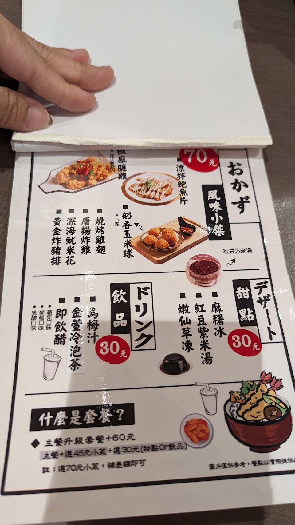 不吃肉,詢問才知道有隱藏版蔬菜丼料理,蛋花和米飯很好吃,加上茄子、地瓜、紅椒、小黃瓜、玉米筍,再灑上芝麻和青蔥,整碗色香味都有了,還附小菜(連藕耶!)和味噌湯,整份都很新鮮、也吃的飽,味道稍重,下飯,ㄧ下就吃光,推薦