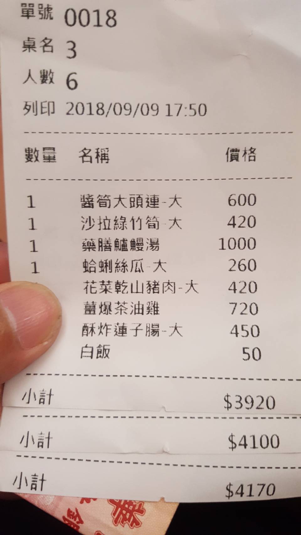 六點多去吃,中間上一盤炒水蓮不脆有點老、茶油雞有點過熟,其他的菜色(綜合生魚片、蝦仁炒飯、炒山蘇、炒櫻花蝦高麗菜、炒鱔魚(微焦)、炒鱔魚意麵(偏甜)、炸銀魚、藥膳鱸鰻湯、胡椒鳳螺、鳳梨蝦球、蒜香蜂蛹、筍殼魚湯…都很好吃,後面服務生來收桌時有跟她說一下,可惜廚師下班了,不然還可以幫我們更換。?