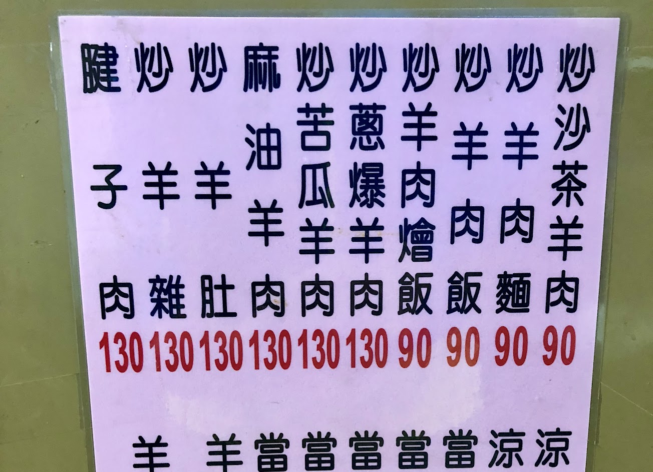 品項豐富,包括羊肉爐、炒飯、炒麵、各式羊肉熱炒以及羊肉湯,有清湯類還有當歸湯可以選擇