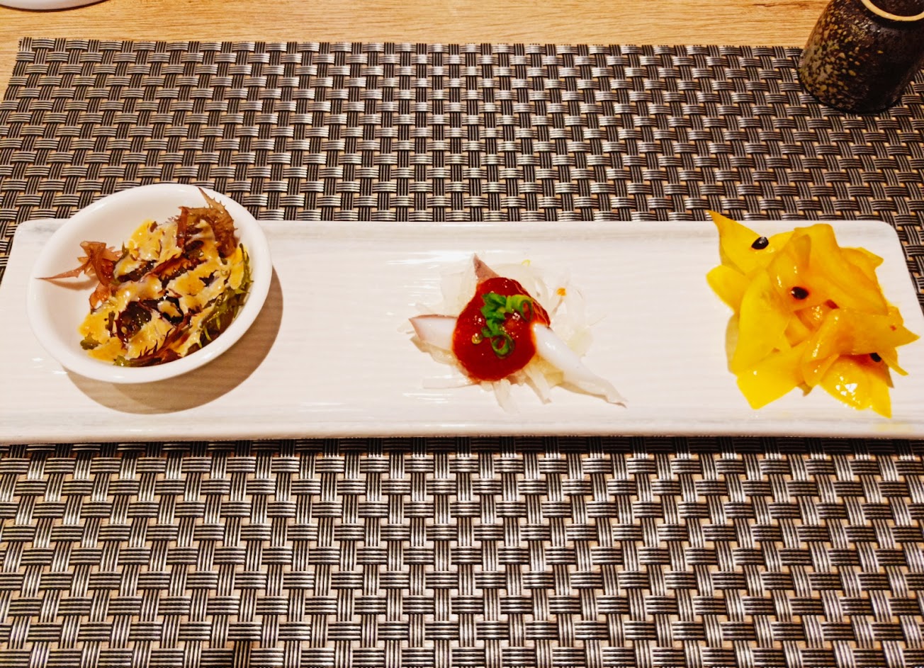 套餐500元,兒童350元,少了手捲、烤蝦和飲料,從前菜到果汁飲料和水果共10道,沒有菜單,但每周有兩道主菜供選擇,我們這次去的是一道松阪豬肉和一道鮮魚提供我們選擇,其他的配菜則由主廚搭配,與老闆娘聊天後,才知道店裡每個星期二會更換菜單。
