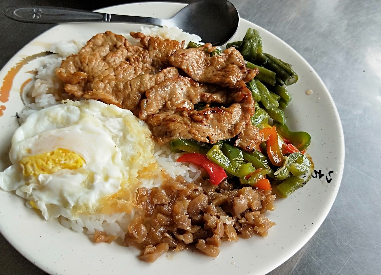 1.招牌的豬排飯豬排有點薄,配菜所以說不上豐富卻也還過得去,白飯上面有淋上醬汁,醬汁有用洋蔥炒過,還蠻特別的風味,吃起來帶點甜味配上洋蔥有解膩的效果,吃的出店家的巧思!