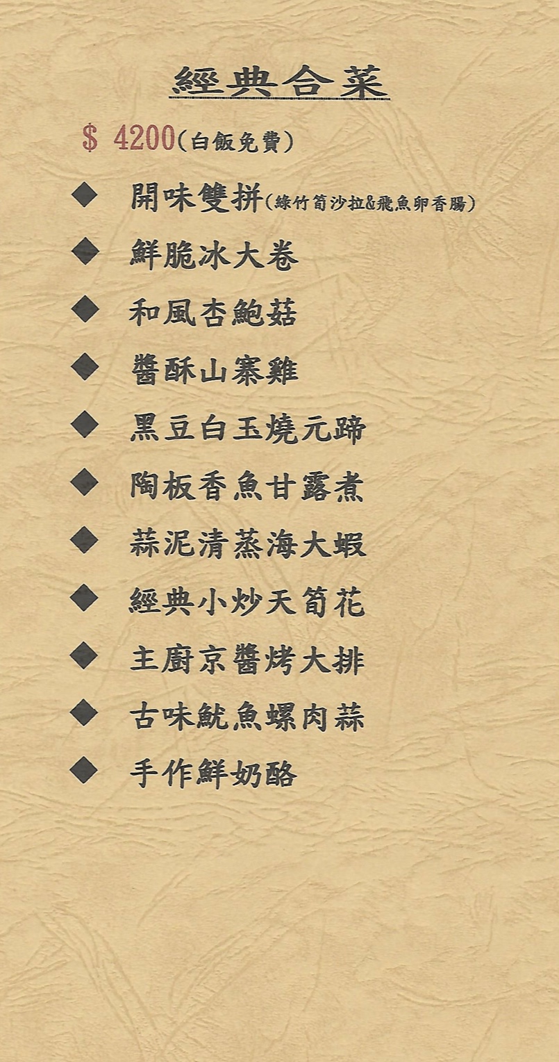 梅香子排, 醬酥山寨雞 經典蛋花湯 鹽酥杏鮑菇 招牌醬豬肋, 梅香排骨, 鳳梨蝦球, 蛤蜊湯, 鮭魚炒飯, 炒水蓮, 吻仔魚煎蛋, 蟹黃豆腐煲, 蛤仔湯, 宮保蝦球, 乾燒花菜乾, 蝦蝦, 三杯雞腿, 四季大腸, 豬肋排, 新鮮石斑魚, 化骨豬蹄