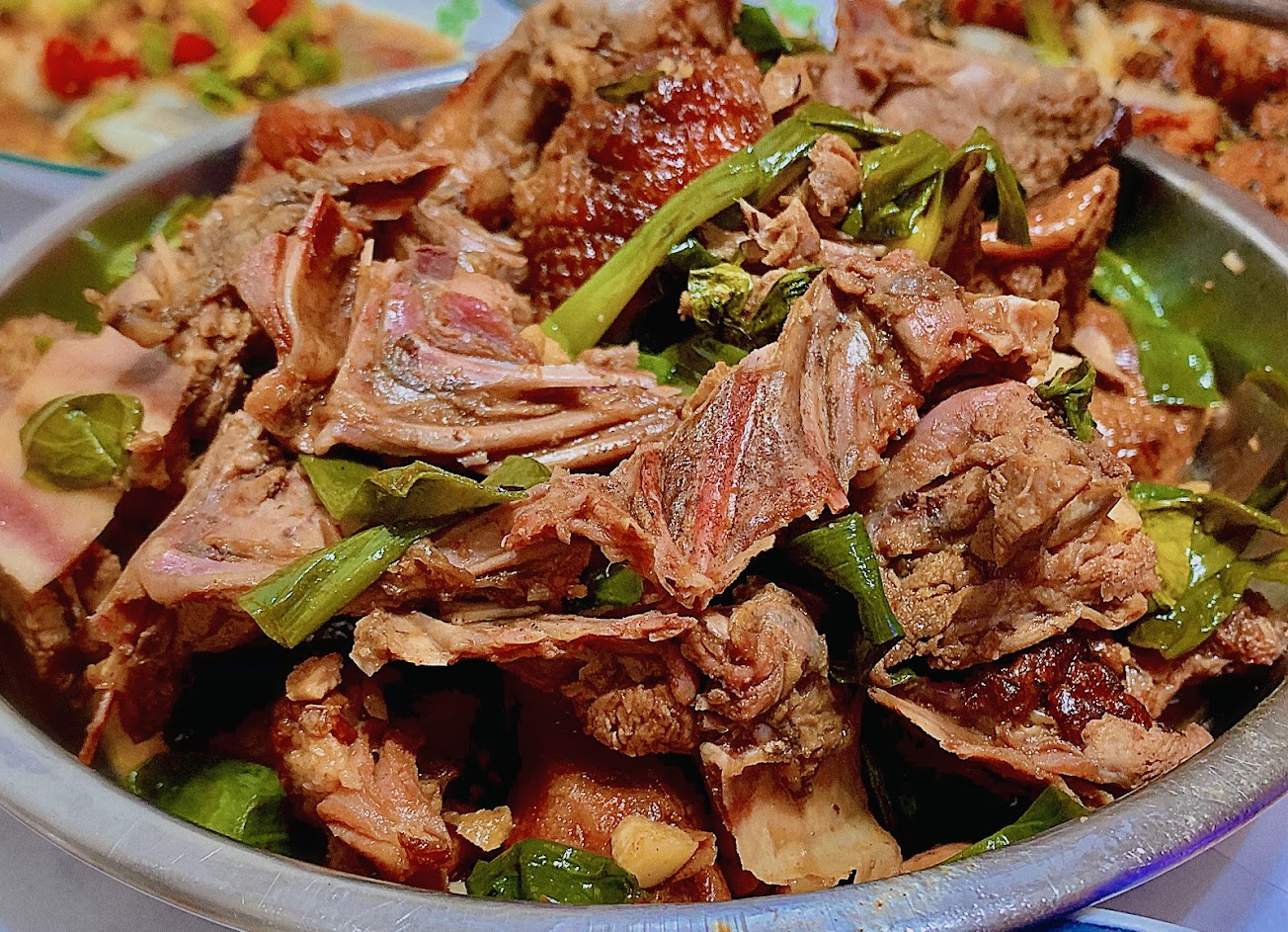 餅皮薄,但是可能準備太多,吃到壓在下面的餅皮太潮了, 濕濕水水的,變得沒有麵粉的香味…… 肉稍乾,麵醬味道足,但比較鹹&不夠甜 炒鴨架香,九層塔&蔥段夠多