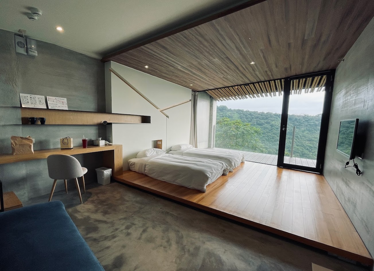 假日雙人房$4600不便宜,但透明大窗看出去的山景真的舒服、放鬆,房內也能泡澡,寬闊的陽台很適合溫暖的下午睡午覺~