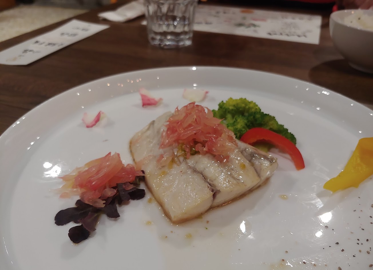 因人數較多,服務員幫我們分2桌坐,我們這桌有4大人1小朋友(7歲),剛開始用餐時覺得前面幾道配菜雖有些不合口味,但也算創意料理,尚可接受。後來上湯品後則是發現喝到剩1/3左右時,表面與湯匙上開始出現油結凍的狀況,口感有點不佳,其實在餐廳還是第一次遇到這種狀況。到了主餐部分,剛好我們這桌點的都不一樣,1.小朋友點豬肉排咖哩,豬肉是切小塊在咖喱裡,小朋友反應豬肉很硬,大人吃了發現真的蠻硬的,跟服務員反應後,服務員表示要補一碗改成雞肉的咖喱,結果雞肉咖喱的雞肉還是偏柴的口感,在選擇肉品部位部分尚需改善,白飯倒是蠻好吃的,小朋友還點了第2碗,另外,在餐後飲料如果改成果汁會更適合小朋友。2.鮮蝦主餐有感覺蝦肉質是好的,但吃起來就也是偏硬,不知道是不是煮過頭了。3.奶香鮭魚主餐並沒有魚肉鮮嫩的感覺,或許是厚度偏薄,吃起來就是不夠嫩也不到過硬。4.燉羊肉主餐上桌時溫度明顯不夠,很像煮好放了一下才端上桌的感覺,羊肉反而太軟不夠Q彈,也是隔一下就開始出現油脂結凍狀況。5.燉勒排主餐吃起來還算ok,就中規中矩。另一桌沒有特別詢問餐點問題。