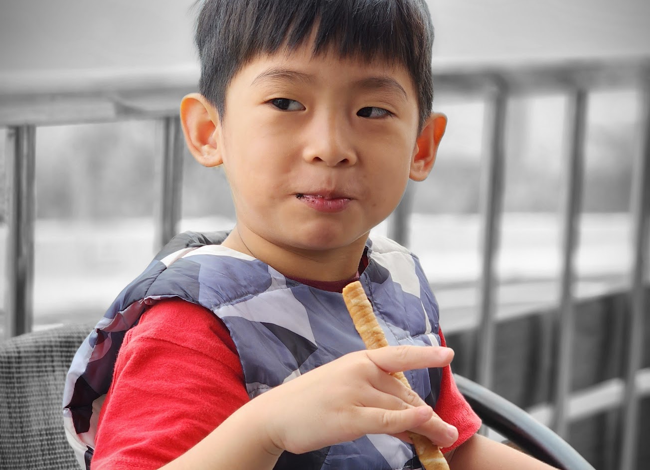 展望超級的好,坐在靠路的座位上,眺望大凍山,在下午時分暖暖的陽光把大凍山腳下襯托出一整片翠綠的山谷,我們在紅色的陽傘下看著山谷中的小房子,想著宮崎駿的動畫。