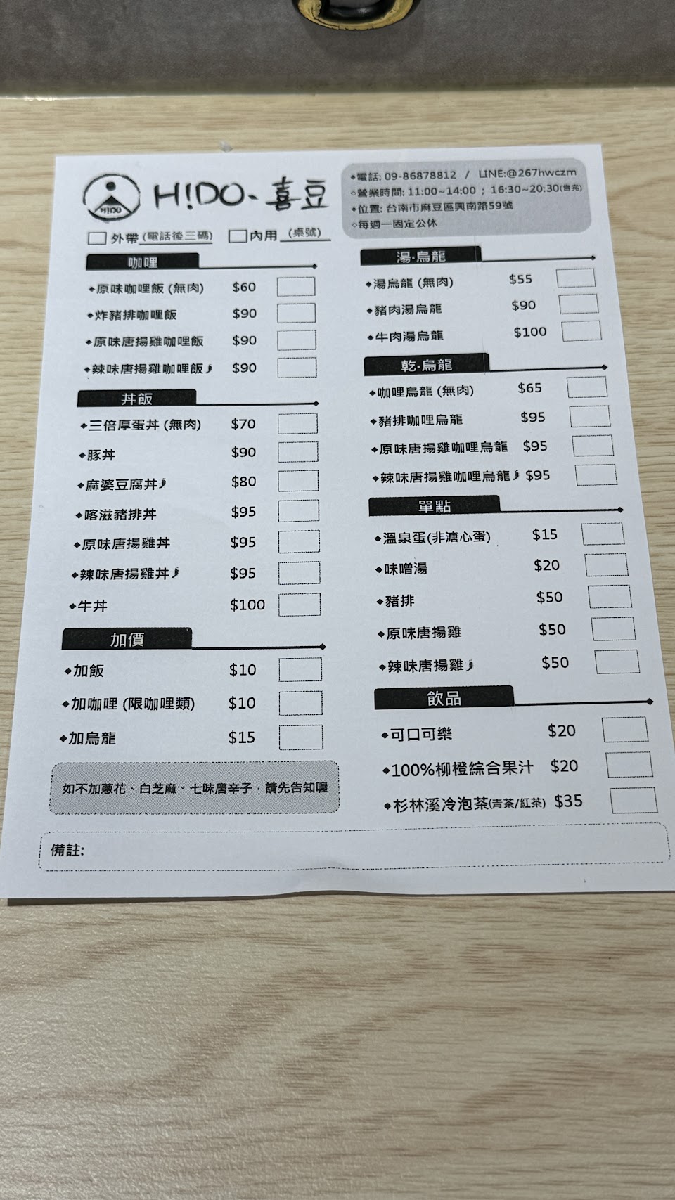2024最新在地推薦餐廳的菜單_HiDO•喜豆 咖哩&丼飯&烏龍(麻豆店)的菜單、圖片