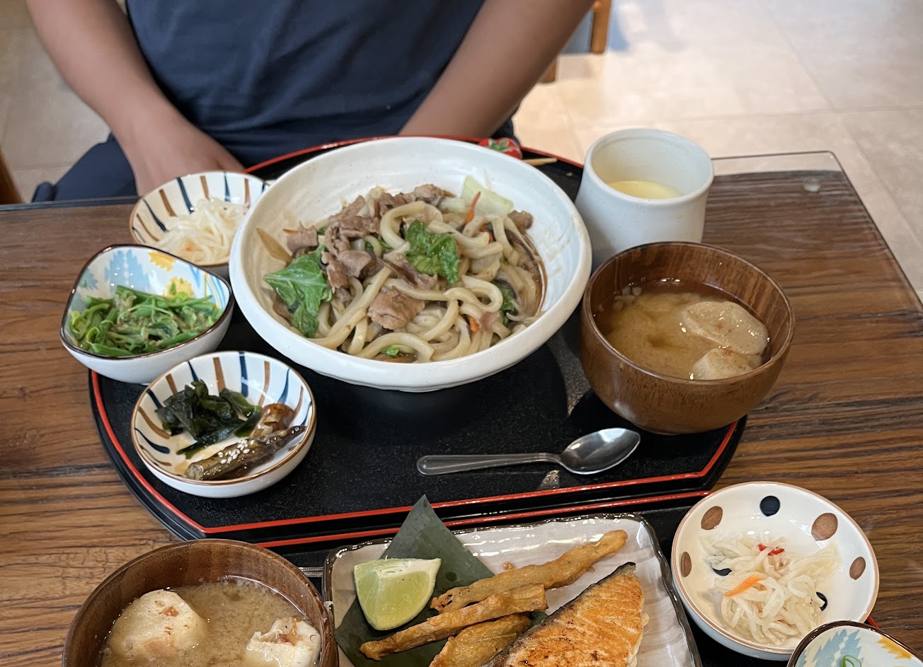 烤鮭魚套餐裡的鮭魚非常鹹,很好吃。配菜種類豐富,味道鮮美,有牛蒡天婦羅風味的糖醋麵、蔬菜肉丸等。茶碗蒸不太好吃。味噌湯有點台灣風味,加了一點冬瓜油。我覺得如果白飯煮得更鬆軟的話我會更滿意。