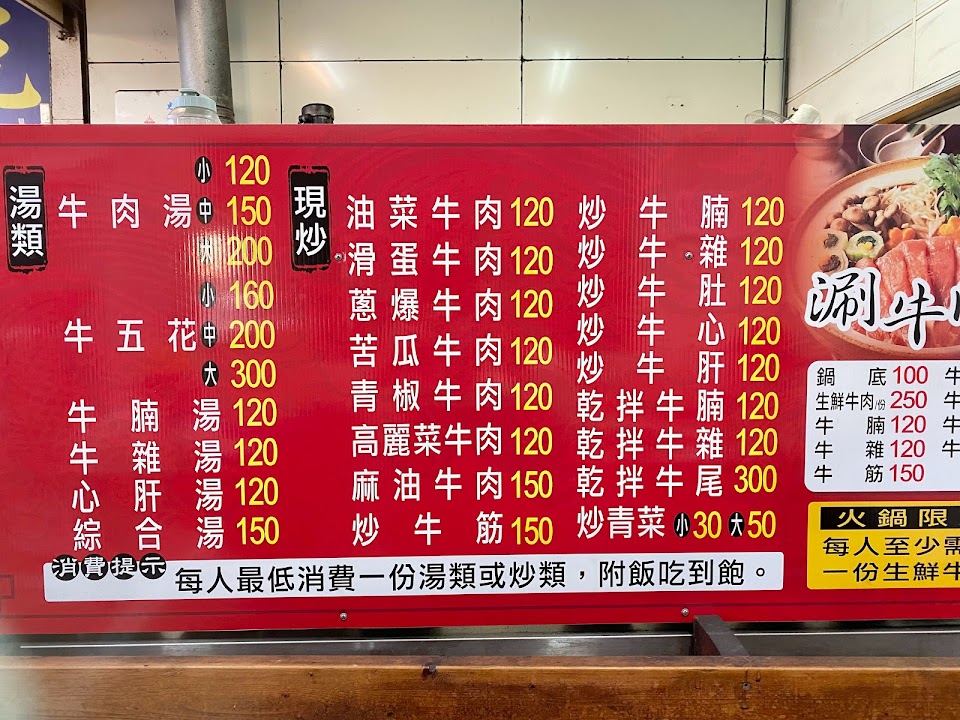 炒牛肉類都是一份$130、炒青菜大份$50、牛肉湯$130。