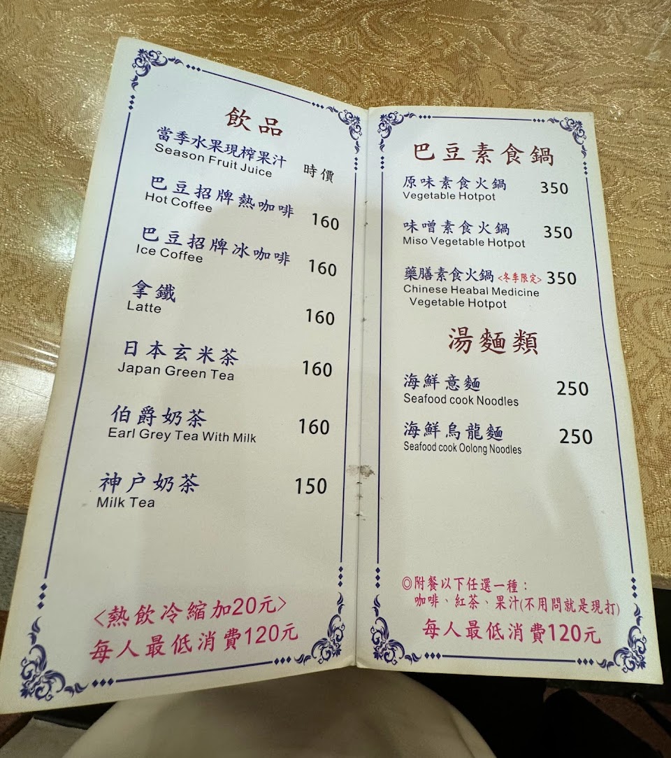 餐點好吃,食材健康,服務親切,氣氛悠閑,價位中等,低消120$