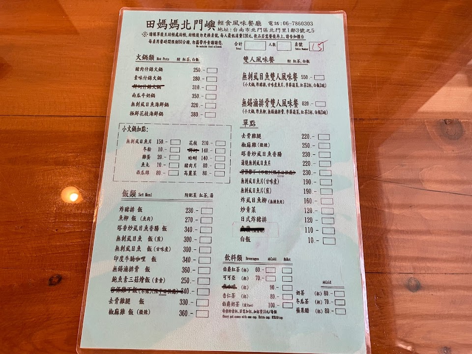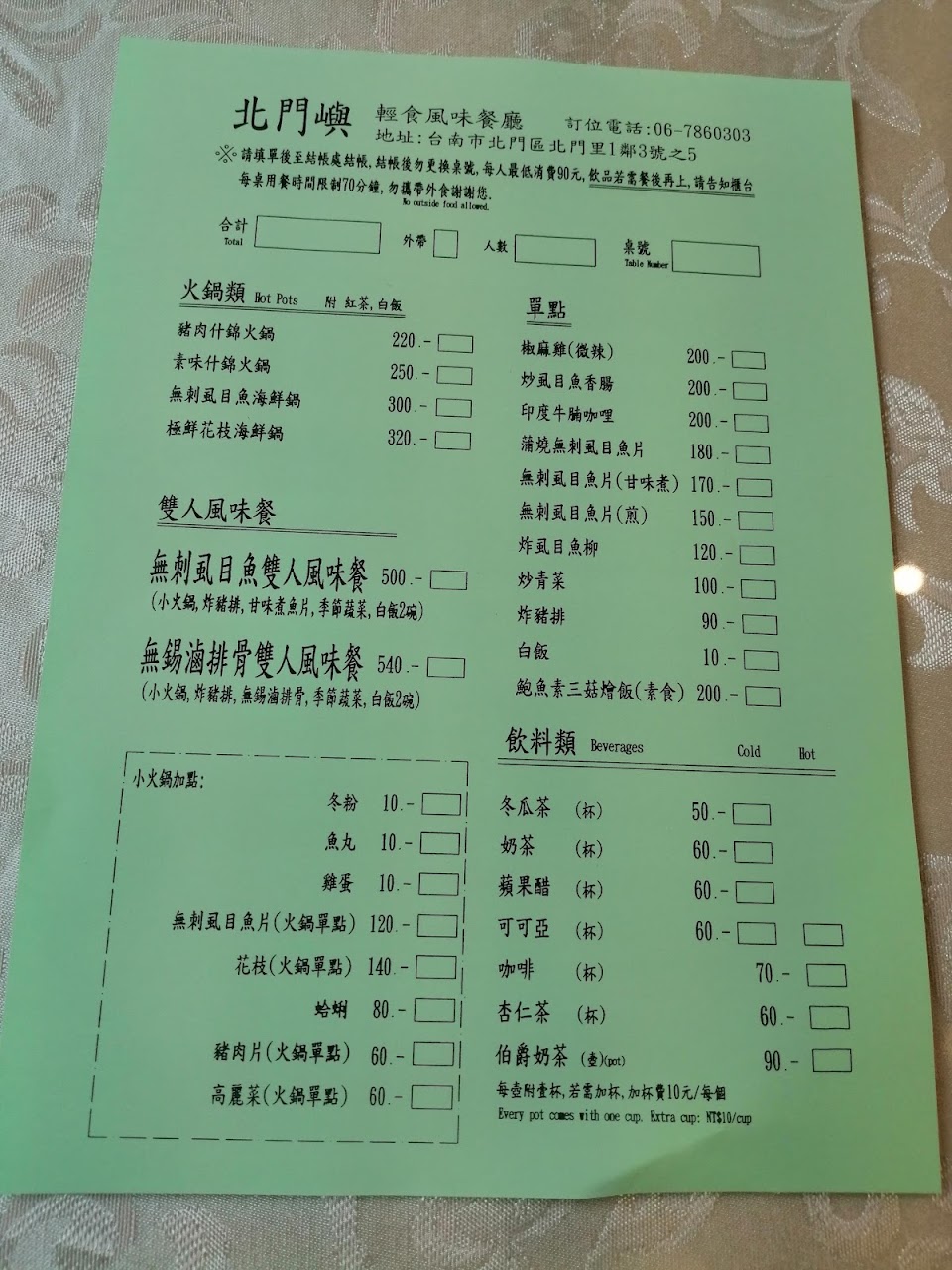 整個餐廳都屬木式建築,算是五色古香,聽說是老建築改的,餐廳主要以虱目魚料理為主,招牌餐點是虱目魚套餐,這一次的用餐,除了有一種餐點沒機會點,那就是要提前預約鮮蚵火鍋,所以我們點有南瓜牛奶鍋、虱目魚海鮮鍋、極鮮花枝海鮮鍋、無刺虱目魚雙人風味餐、無錫滷排骨雙人風味餐;單點椒麻雞、塔香炒虱目魚香腸~口味說實在的不錯吃,鍋類的部分海鮮算是新鮮的,滷排骨滷的也入味,椒麻雞真的是外酥內嫩,而司目魚香腸吃起來真的有虱目魚的味道,讓我覺得可惜的是量有點少,一盤椒麻雞要價250元,切起來才四片,而一盤虱目魚香腸要價230元,組合起來我猜只有兩條吧?,想吃虱目魚香腸的,建議可以到井仔腳鹽田旁再買來吃,至於2種雙人風味餐,雖菜單上有寫附兩杯紅茶,哈!結果其實是點餐後,紅茶自助式喝到飽,個人覺得如果想嘗試多種口味可以這樣點,不然我覺得吃單人的火鍋類會比較划算~ 也感覺會吃的比較飽。