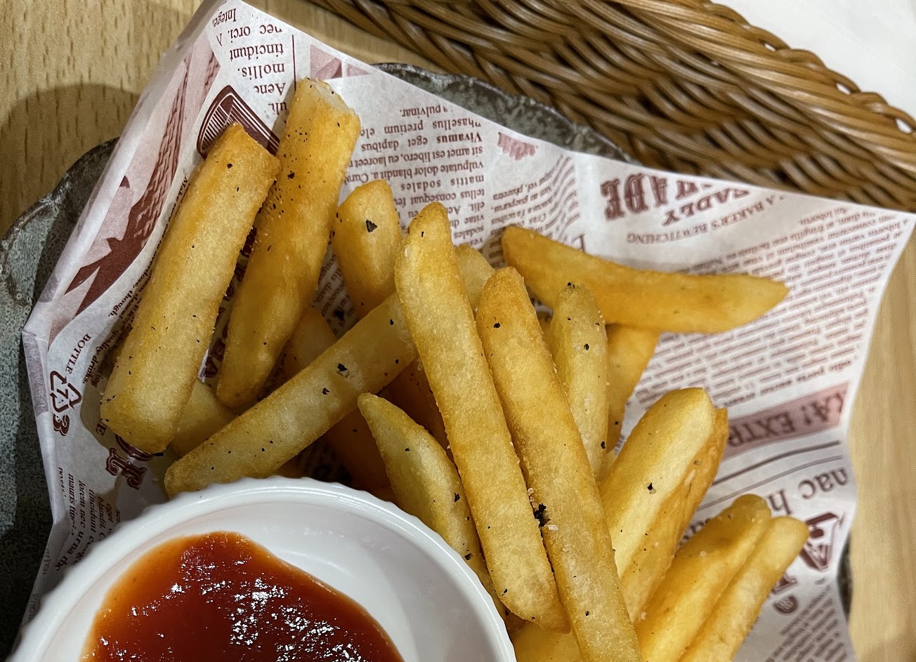 牛排煎的洽到好處,雖然是五分熟,但是沒有看到半點血,外面有一點焦香味,但肉卻很嫩,配上甜甜的地瓜和生菜,很順口,兩三下就吃完了,薯條也很推薦,好吃很ㄙㄨㄚˋ嘴!