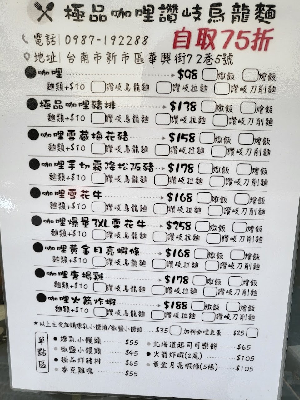 店家是以外送或是外帶為主,沒有內用位置,外帶自取的話是菜單上的75折價。咖哩豬排好吃,自取的話相當划算,點麵食的話另加15元,烏龍麵條Q彈可口,下次會想再試試看炸蝦咖哩,或是其他餐點。