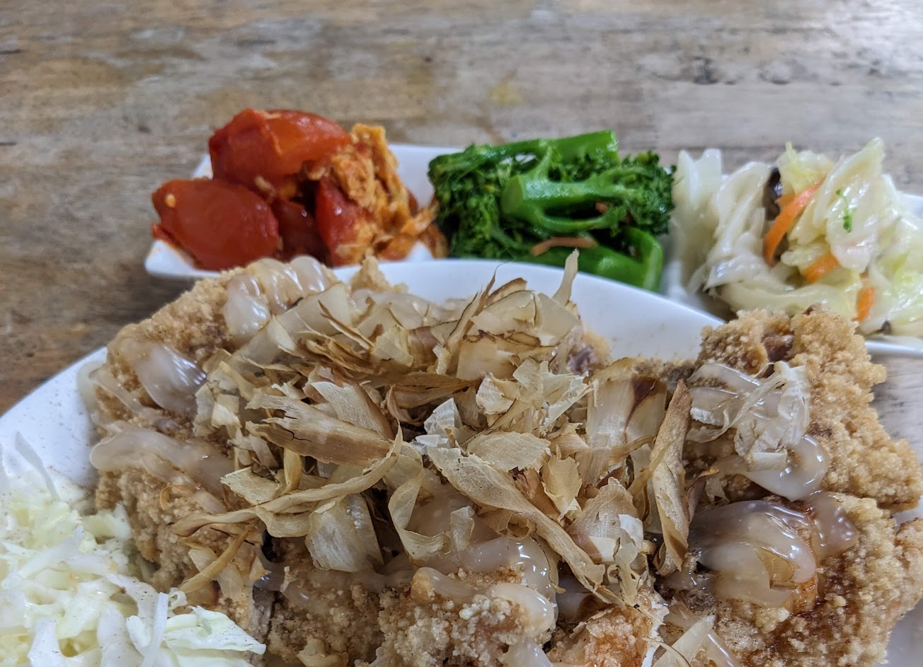 定食有三樣小菜,主食皆為炸物,可樂餅和唐揚雞好吃,還有附一些高麗菜絲和蛋,吃得很滿足