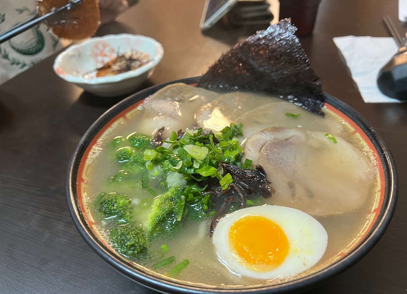 軟嫩的花椰菜?麵條和湯頭皆可言做選擇,叉燒也很厚,還有老闆招待的馬鈴薯可樂餅~都超級好吃!