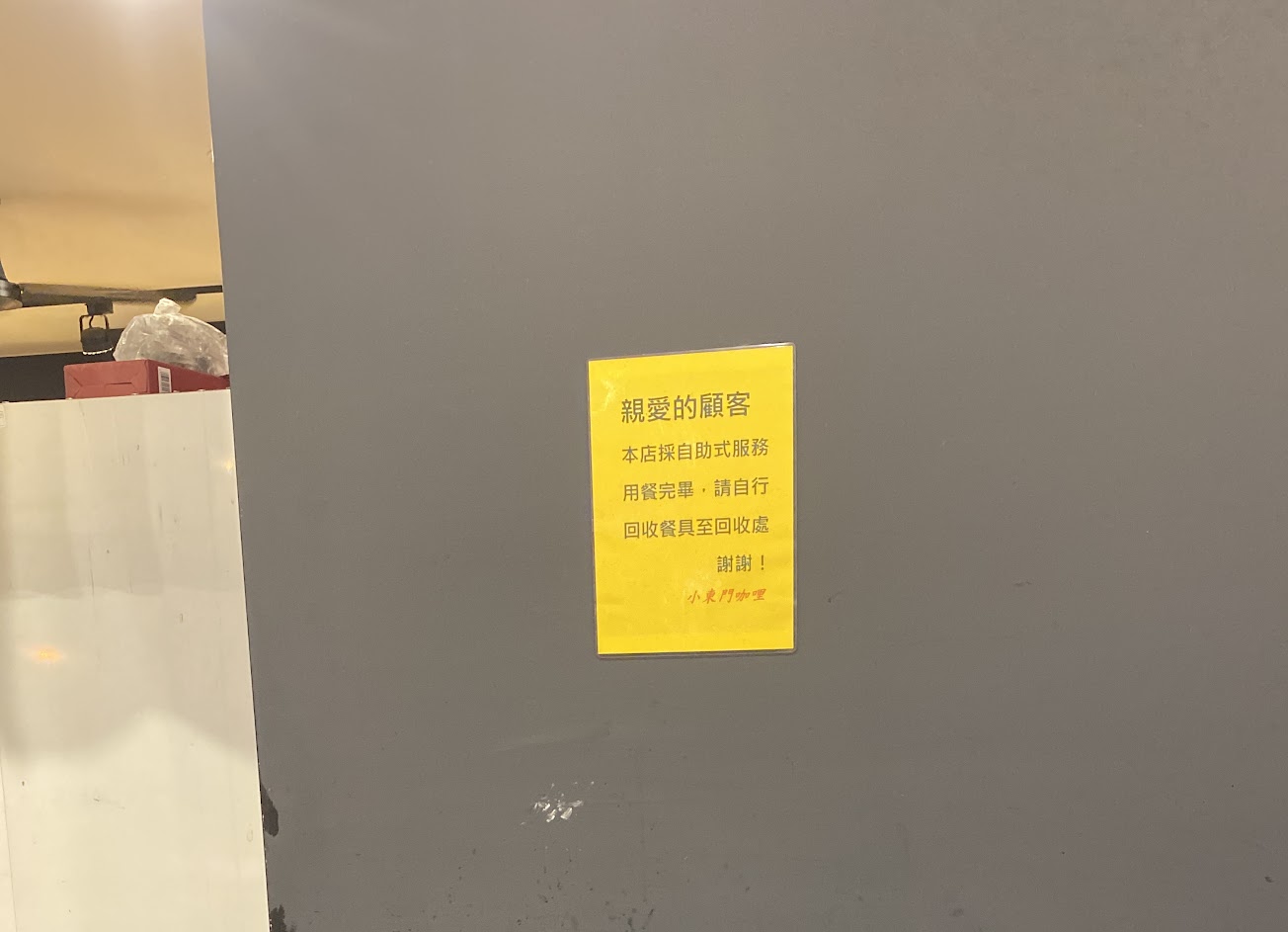 小東門是個真正落實客人自助回收的店家,連桌面上的衛生紙也沒有整理過。告知店內的阿姨/小姐,我們需要借用抹布擦拭一下桌面,結果服務生衝出來撇了兩下就走了,抹布似乎還是乾抹布。可能以為我只是反應桌面落塵附著吧