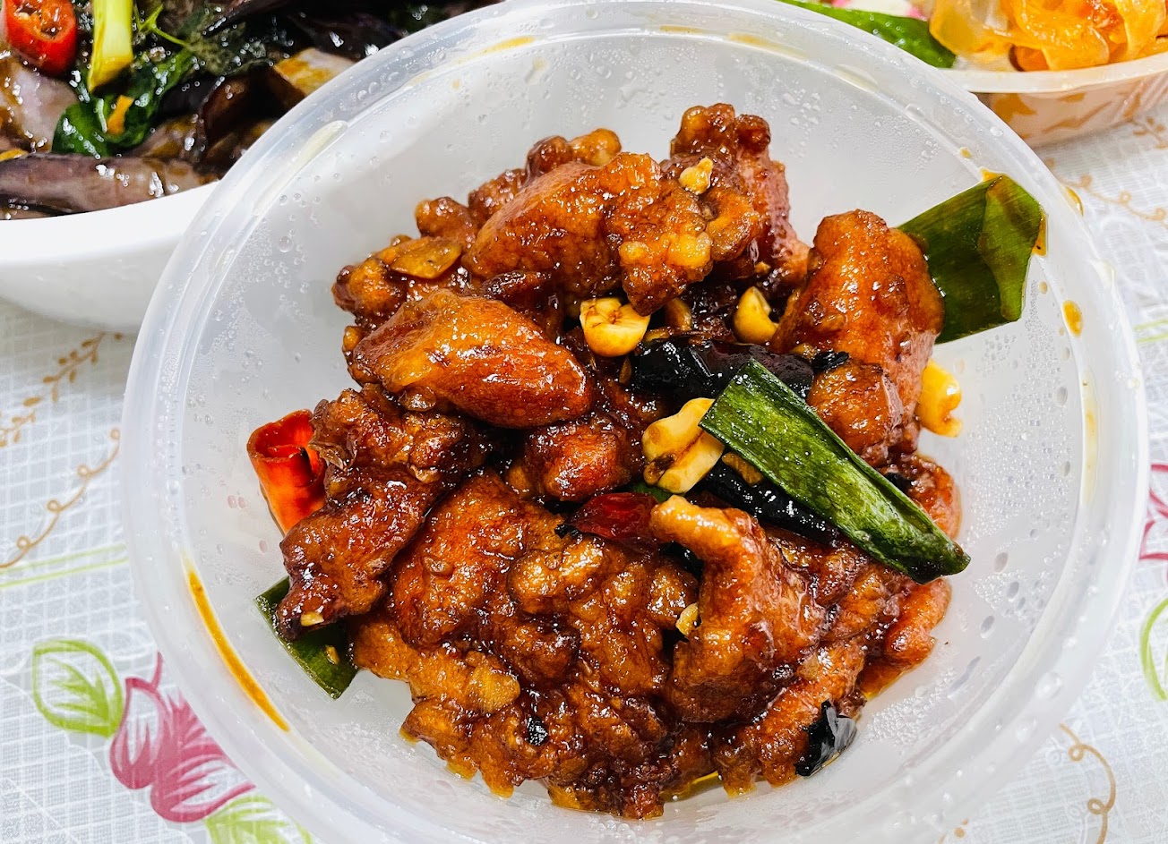 用外送平台點了雙主菜便當和單點茄子,宮保雞丁辣度超爽,皮脆肉嫩,還有搭配花生,超好吃的主菜!蒜泥白肉不會過肥剛剛好,蒜泥醬汁味道很蒜,底層有豆芽菜,醬爆茄子很入味又不會過油很下飯,四樣配菜還OK中規中矩,白飯很Q不會溼軟,免費贈兩杯飲料,整個份量兩個人吃下來很飽!