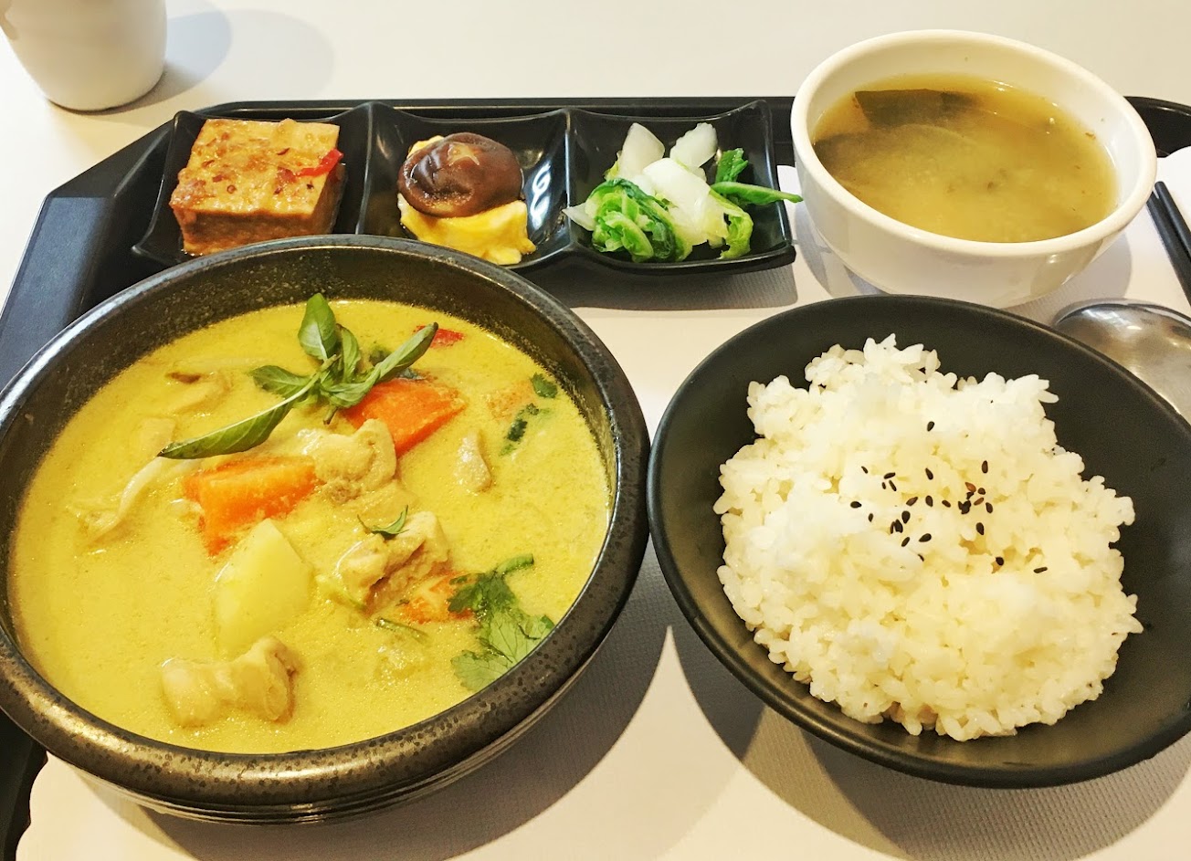 清淡健康風味的綠咖哩雞。水果汁好喝。