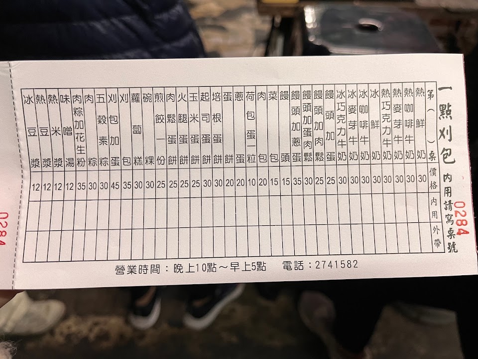 刈包料多實在又美味,粉漿蛋餅跟煎餃也很好吃??還有小時候常喝的調味乳可以選擇,雖然環境上沒有這麼優秀,但以這價格來說算合理,每晚到了10點門口就會排一堆人,內用或外帶都要先填單,然後插在桌子上再等叫號,內用記得要寫桌號!!