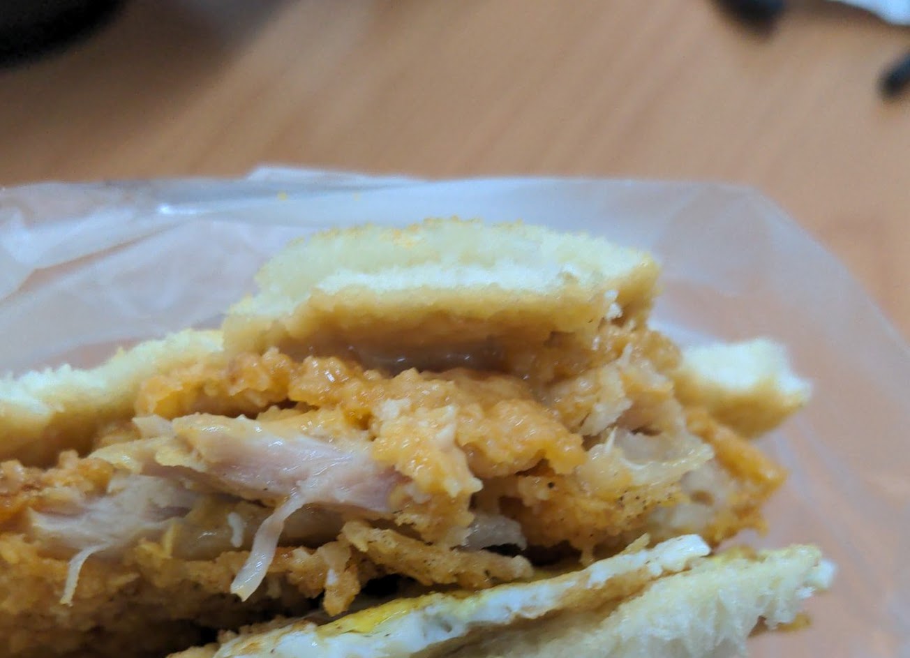 內容物只有蛋跟肉還有一點美乃汁,沒放任何蔬菜,我吃完之後還去隔壁超商買生菜沙拉吃…