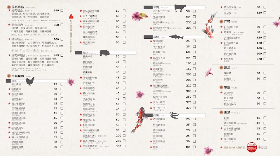 店家每天都會有一樣餐點買一送一,而串燒則是以單支計價,個人覺得很貼心,如此就能品嚐更多不同的餐點品項。