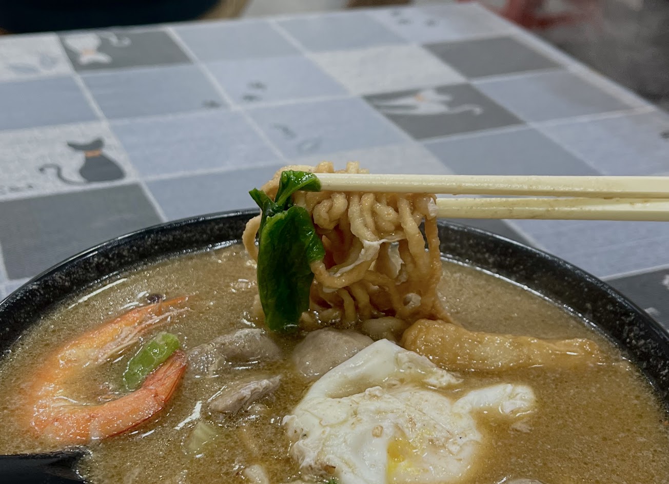 太多雜味,吃得出來從叫料、庫存、用水都有管理上的瑕疵,湯一喝就知道是台南的自來水,很硬,麵體本身參有別的味道,應該是倉庫裡跟什麼食材混雜一起放,豬肉片一般,有可能是組合肉,蝦子還行但不夠新鮮,蛋沒有香味,還好沒有加點蛤蜊,又小又不太新鮮。