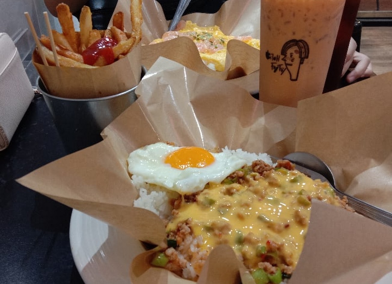 中餐來剛好有位置,可愛女店員馬上招呼,介紹菜單很詳細,點了打拋豬肉飯和打拋豬烘蛋飯加起士,都很不錯喔!