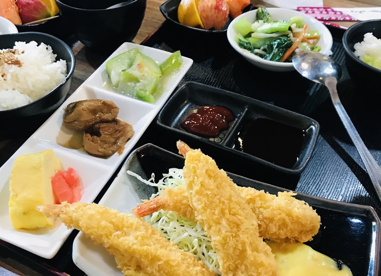 女兒今日點了炸蝦日式套餐,裡面有小菜、沙拉、水果,主要三條炸蝦裹麵包粉不會很厚,咬下去很脆嫩,香氣十足,好吃,連味噌湯都可以重複續,價錢又很合理。