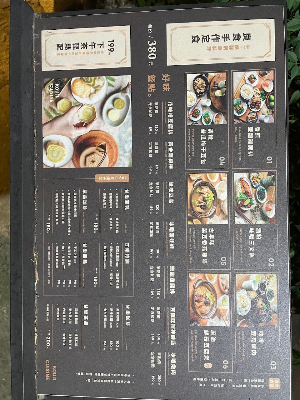 手作定食皆是統一價格,套餐餐點有含三道小菜、一道湯品,還有手作甜點、養身甘酒、水果,