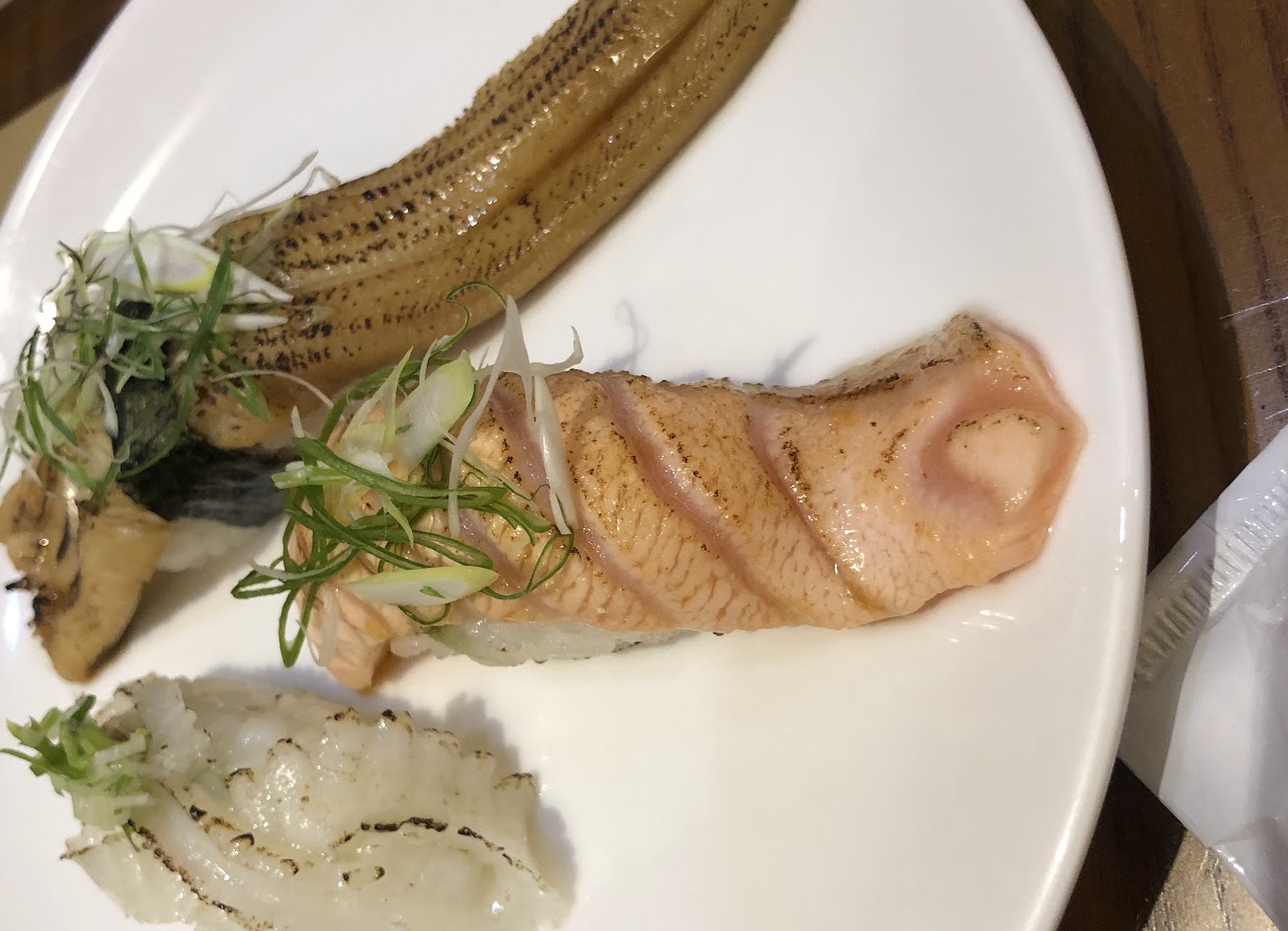 許多特色的握壽司個人蠻喜歡的,像是比目魚、鮭魚腹、干貝等,但斟茶遞水的速度要人提醒,卻還可以看到服務生談笑風生…