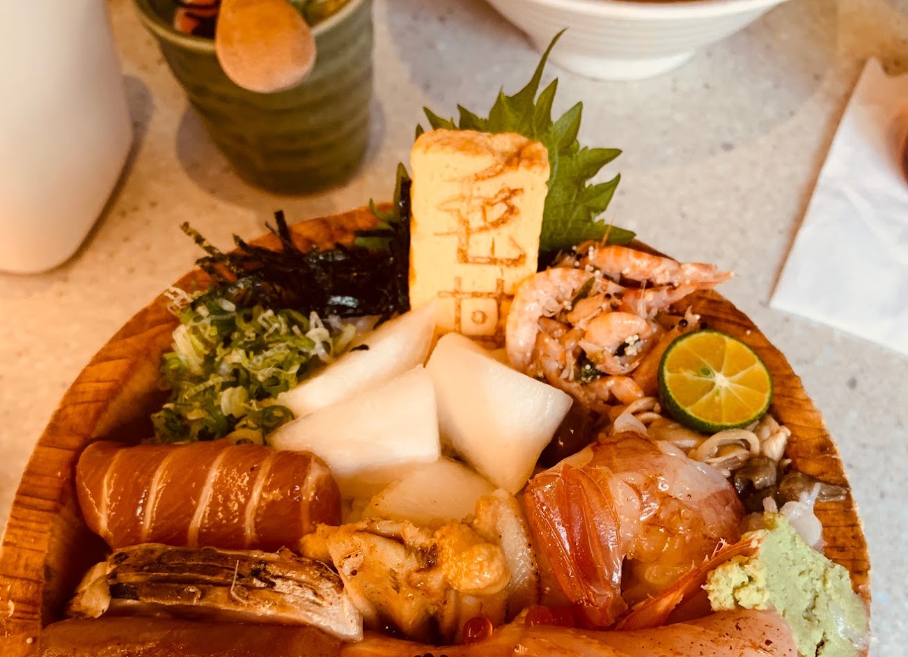 這邊以日式的丼飯為主,但是外觀看起來是個傳統的台式建築。整體消費不算便宜,但是東西蠻真材實料的,招牌的毛丼沒猜錯應該是各種生魚片都來一個,然後裝在木桶裡,但是木桶雖然看起來很大,但就是淺淺的,不過普通食量的人應該還是可以吃飽沒問題,然而這個有個缺點就是吃到後面米粒有可能會卡在木桶邊邊的縫隙,會不太好挖,另外就是木桶中間有個洞,吃的時候很怕飯會掉下去。整體而言這間就是傳統風的日式料理,東西好吃。