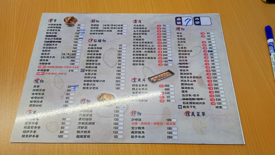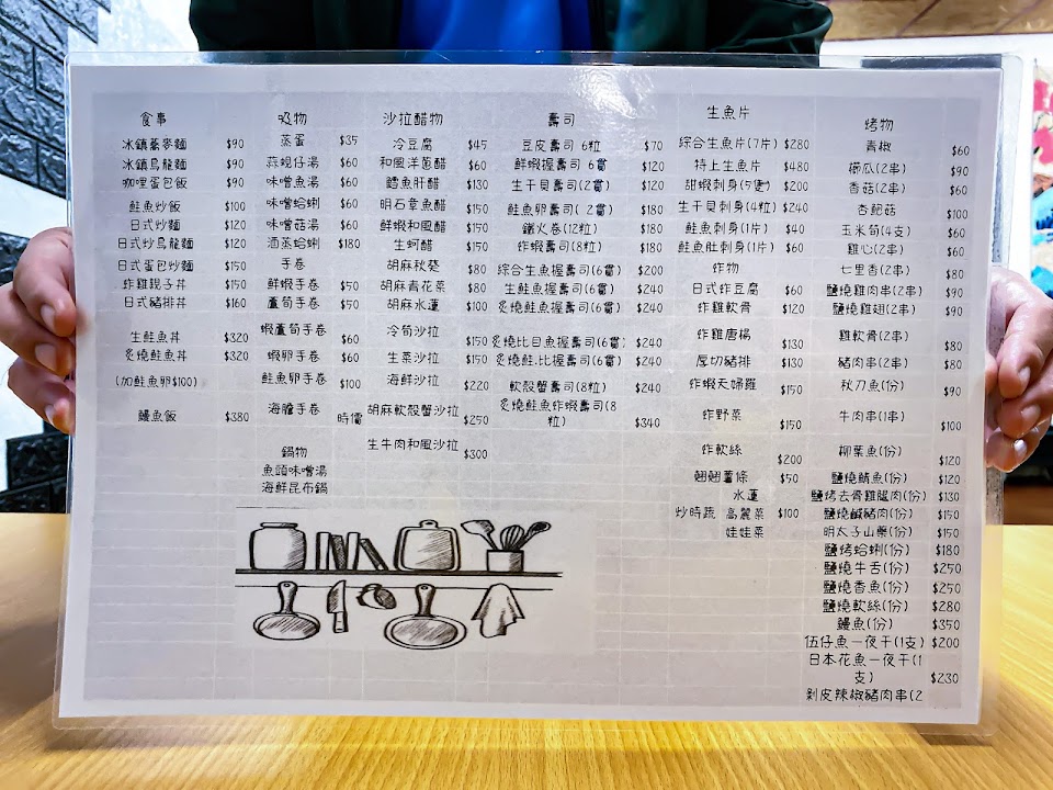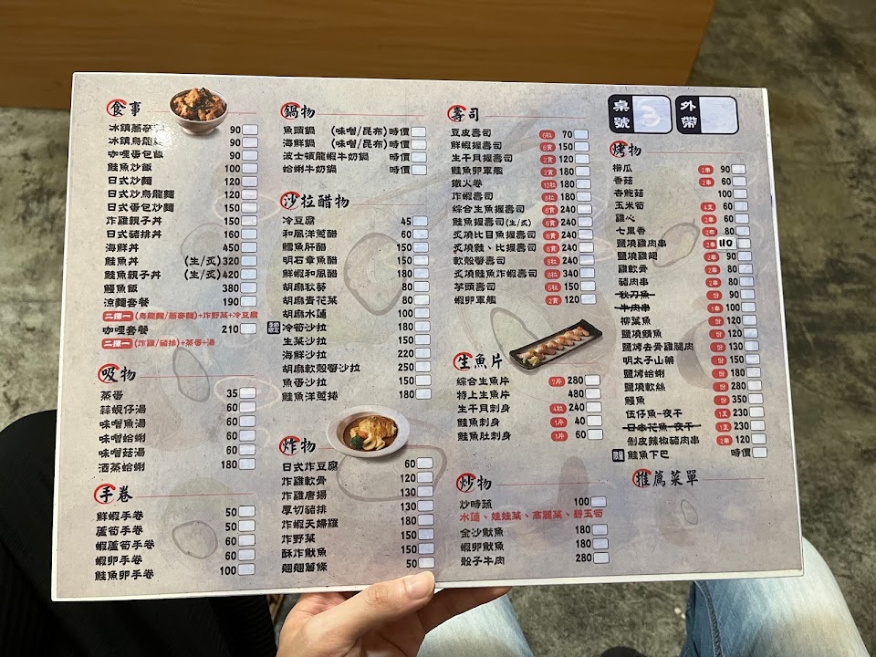 點丼飯有附味噌湯,店內舒適有熱茶,來了好幾次,之前點過雞排丼/鮭魚壽司都好吃。這次點了鯖魚丼飯(150)和涼拌豆腐(45)牆壁上時不時有新菜也可以嘗試之前試過涼拌筍(180元)。再訪日,點照燒雞腿丼(139)加40升級味增魚湯,湯裡面滿滿魚片超級滿足,雞腿烤得也很到位,整體美味想一直再來。咖哩蛋包飯(90)蛋嫩咖哩醬也夠,可惜裡面不是炒飯是白飯,沒有附湯喔~醋洋蔥(60)除了洋蔥還有紫菜非常搭,油醋有柚子香,吃起來清爽,適合夏天點多人分食。炒烏龍麵(90元)份量很夠,材料多。蘆筍蝦手捲(60)蘆筍很嫩份量剛好,許願希望再加一支蝦哈哈。胡麻秋葵(80元)適合夏天吃,很開胃的一道菜。鮭魚刺身(一片40元)吃起來厚度很ok很非常新鮮。