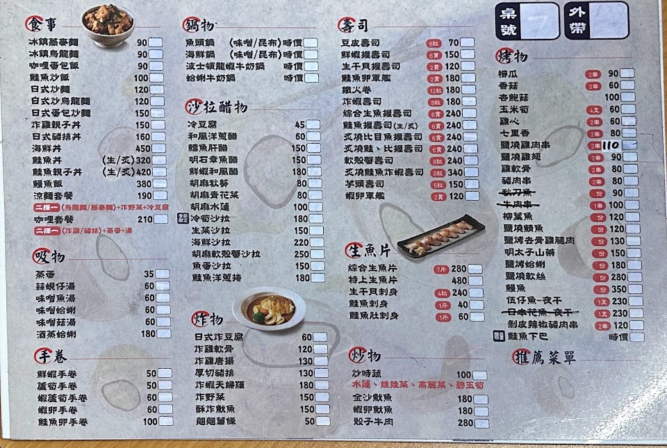 咖哩套餐 炸雞, 炙燒比目魚握壽司, 日式炸豆腐, 雞肉串, 炙燒鮭魚握壽司, 豬排丼近拍, 照燒雞腿丼, 辣味增燉牛肉飯, 涼拌豆腐, 鮭魚炒飯, 定食沙拉, 芋頭壽司, 咖哩豬排套餐, 日式蛋包炒麵, 松阪豬, 壽喜燒豚肉丼, 中 波士頓龍蝦鍋 需預定, 炸雞親子丼
