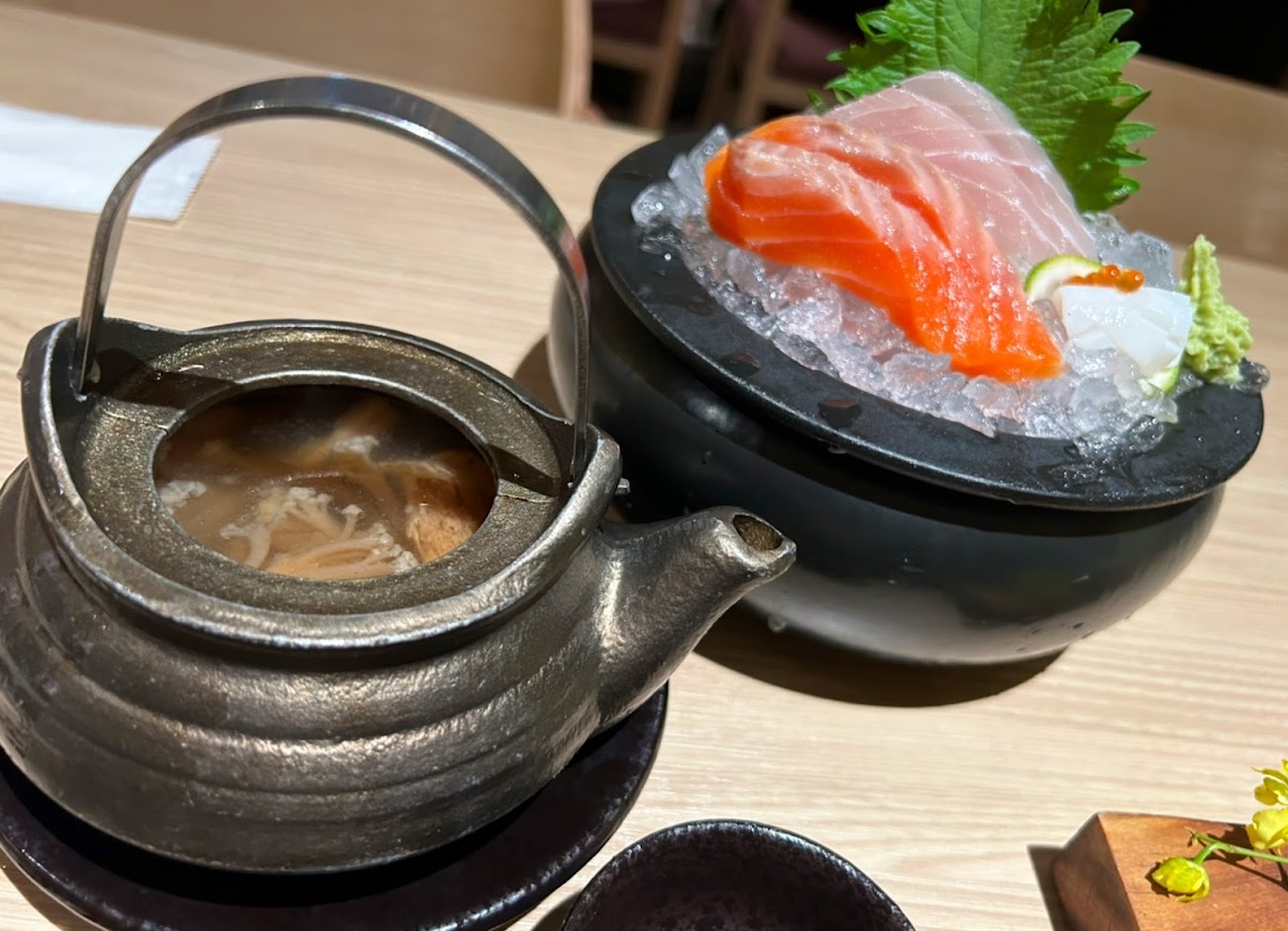 前菜白蘆筍吐司普通,深海魚皮很大碗,口感Q彈但是配有點苦的炸蒜片似乎不太搭。土瓶蒸湯頭好喝。和牛釜飯比鮪魚泥飯好吃很多,白飯質量不錯。烤和牛主菜很精緻,還有三種蘸料生蛋、鹽昆布(超讚)、玫瑰鹽,烤到三分熟很棒。鮪魚排是舒肥口感,烤一夜干魚很嫩,刺身的天使紅蝦味道鮮甜濃郁。飲料的話鳳梨苦瓜汁完全不會苦,好入口。芒果冰淇淋不錯,口感有層次。店裡環境不錯,有時候選擇音樂的質感還有進步的空間,有時候聽到會有點出戲。