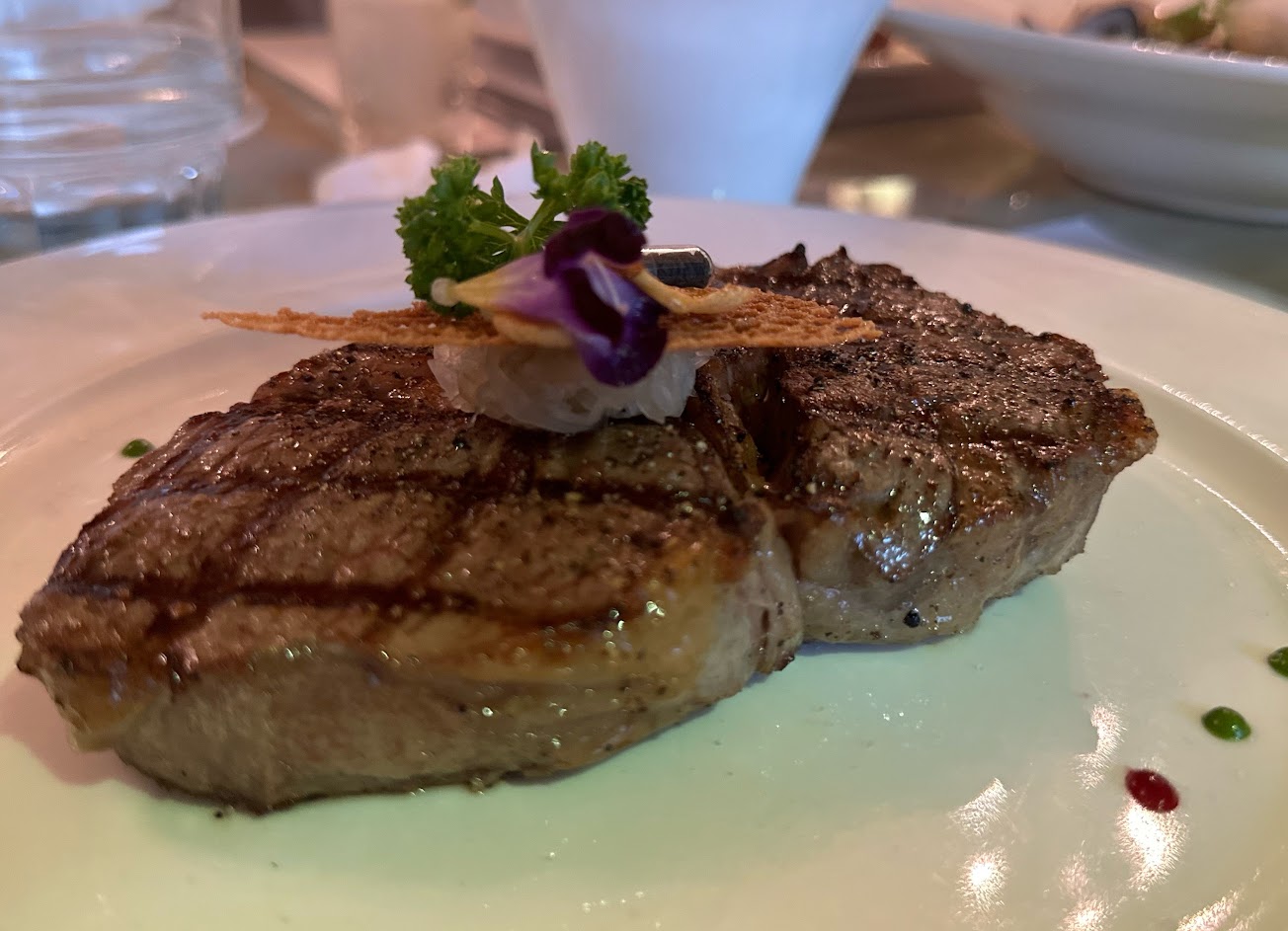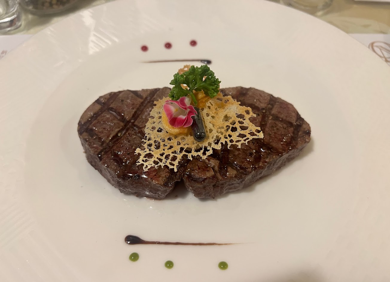 餐廳小小的,座位也不是很多,總是客滿狀態,點餐後會依序送上開胃菜、沙拉、湯、麵包及sorbet,連同餐後水果及飲品,每款餐點都可以續,不僅可以續不同品項,像沙拉及水果都可以針對自己喜歡的細項添加、避免浪費,是超貼心的設計,很容易在主餐上桌前就已經撐到不行XD牛排類主餐也都完全符合預期(小提醒:當天的老饕肋眼相對於過去在其他高級牛排店吃到的偏油一些,不喜歡的人可以選擇菲力),不吃牛肉的長輩可以選擇德國豬腳,皮超香脆又不會硬,肉醃的很軟嫩,難怪開業幾十年屹立不搖。