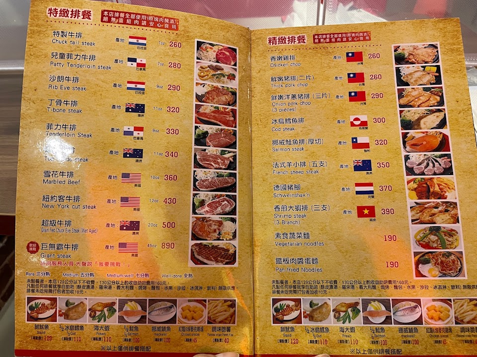 巨無霸牛排, 羅宋湯, 酥皮濃湯, 菲力 牛排 縱切 很厚, 爆米花 梅粉薯條 蒜豆, 霜降牛排, 蘇皮濃湯, 酥皮濃湯 沙拉, 自助冰淇淋, 豬排 機排, 酥皮濃湯 燉飯