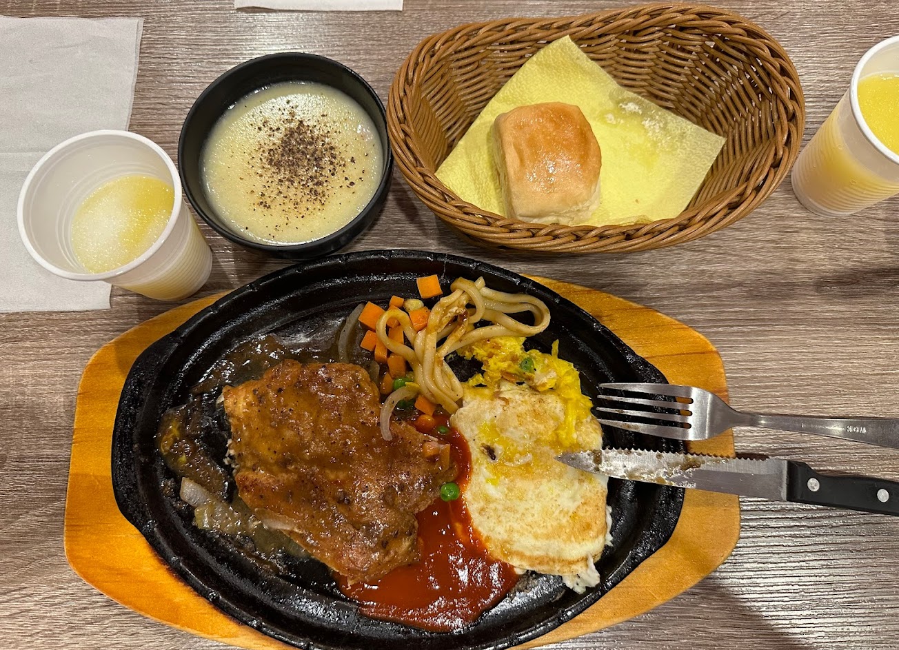 個人不喜歡鐵板麵這麼粗,像烏龍麵,玉米濃湯很淡,吃到一塊牛排筋很硬,不過以價錢來說很划算了