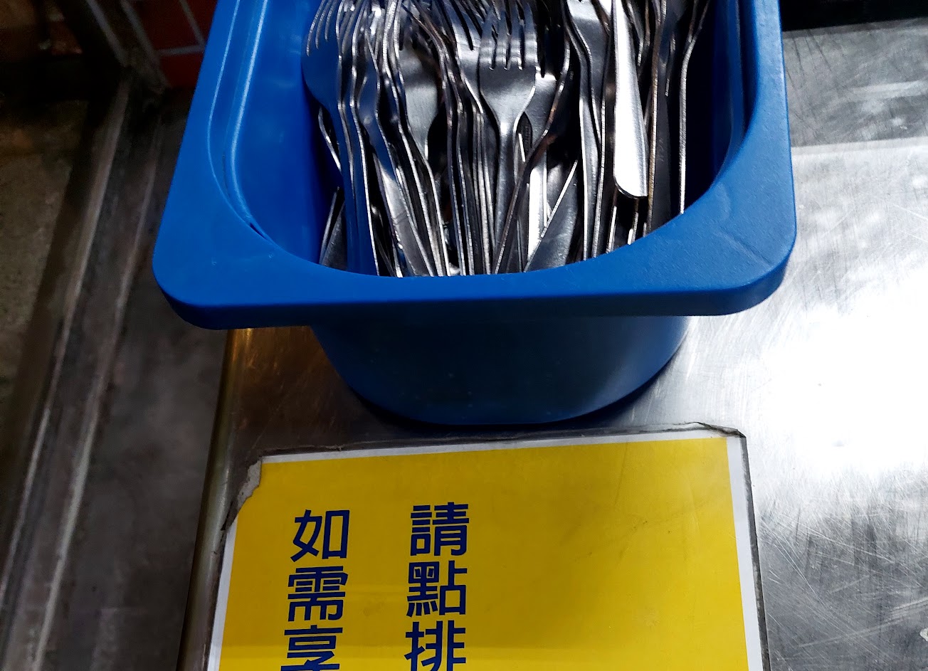 餐具放在外面還不加蓋滿不衛生,裡面那麼多桌子放裡面不行嗎?