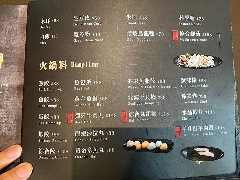 年糕豆腐鍋底, 普洱牛骨湯 黃金蔬果湯, 湯底 跟菇類拼盤, 手做鮮芋肉滑, 牛 橫隔膜