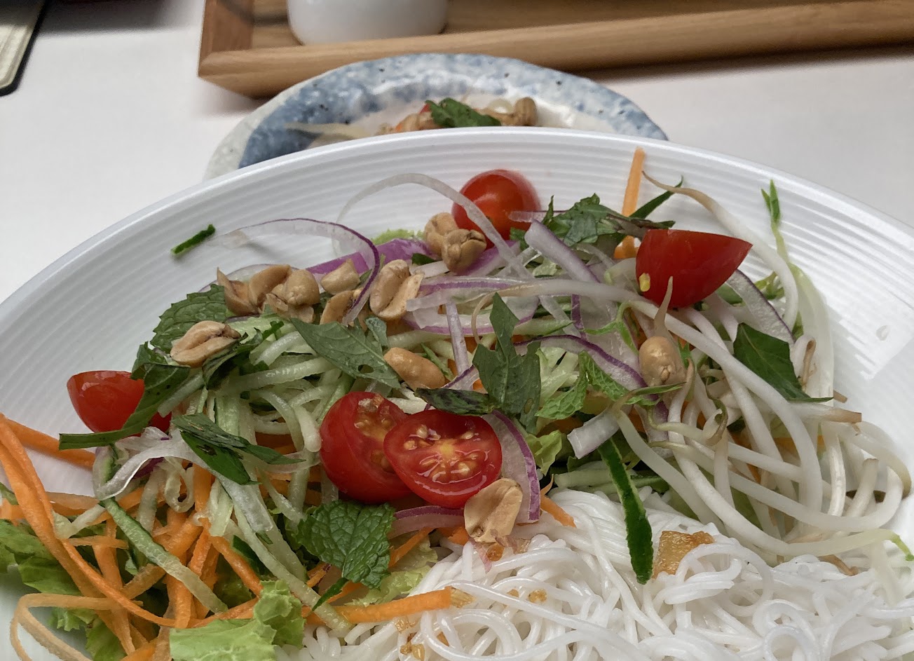 ?越式烤肉涼拌米線:非常清爽,帶點微酸不甜的口感!配上沙拉健康又好吃,烤肉有獨特的香氣!