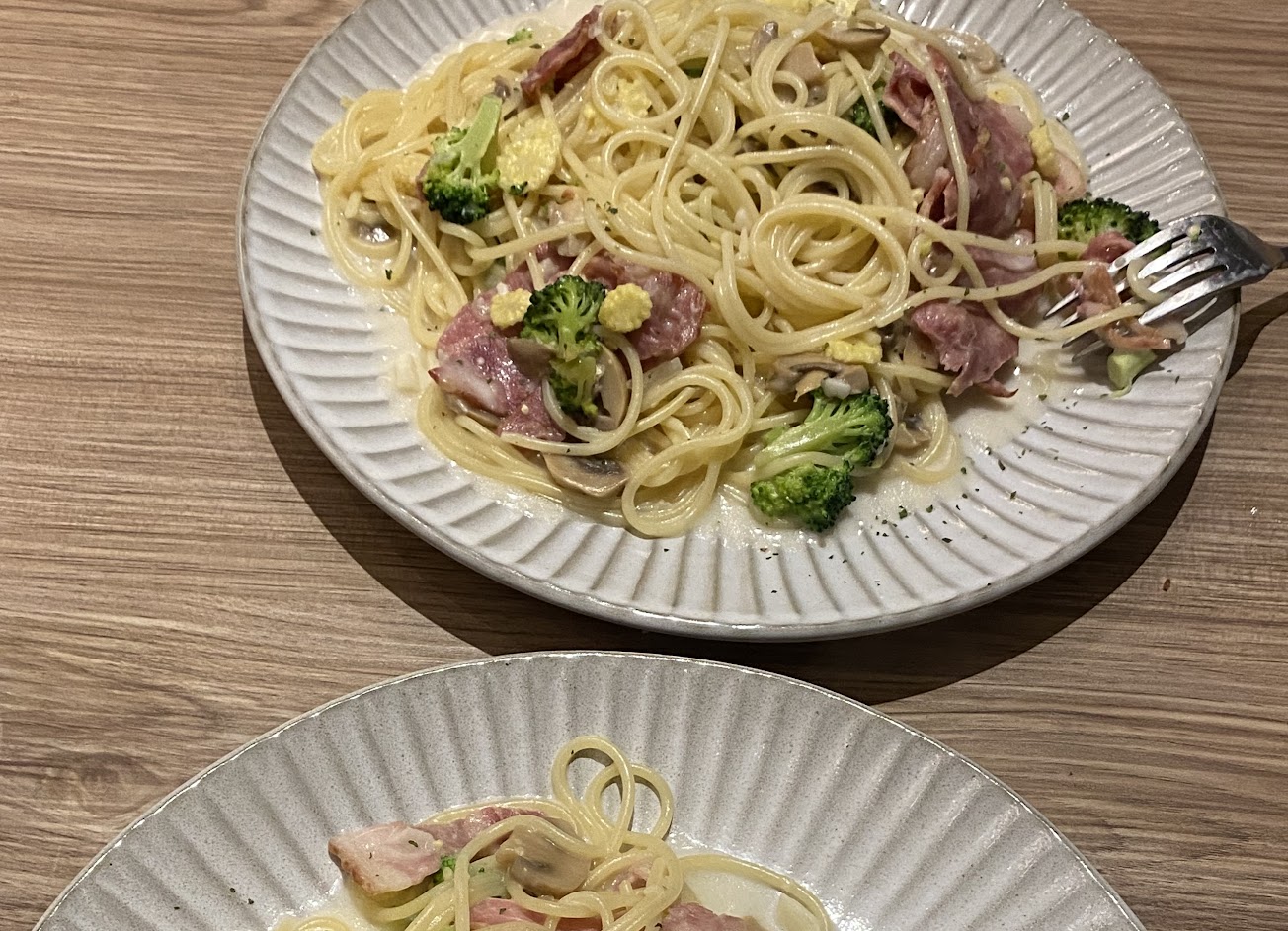 我們點了照燒豬肉披薩、奶油培根義大利麵和羅勒雞肉青醬燉飯、炸物拼盤