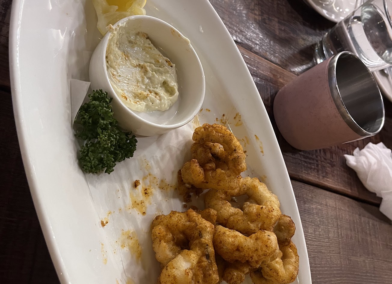奶酥蒜香麵包必點。酥炸軟絲外酥內軟超軟Q,搭配塔塔醬真的讓人一口接一口,玉米湯濃郁好喝順口。反而今天點的燉飯沒那麼驚豔。