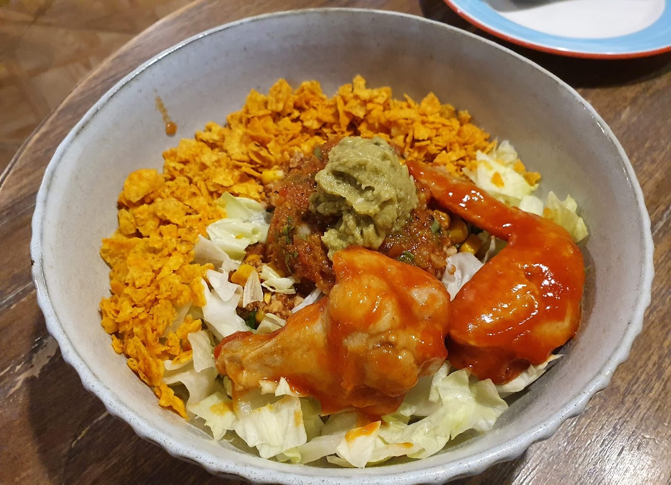 塔可飯是用泰國長米加上一些Doritos淋上莎莎醬,主菜是墨西哥辣雞腿+雞翅,吃起來微辣,蠻普通的。