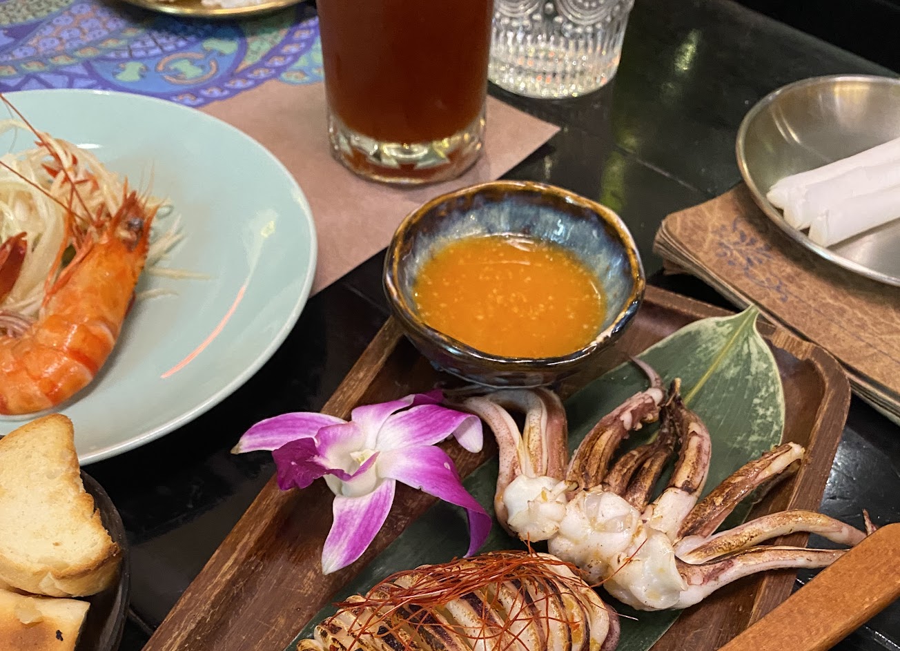 2021/12/11 晚餐吃泰式料理。4人吃了2430+10%=2673元,點了220元泰式炒河粉、300元泰式鳳梨炒飯、260元酸辣海鮮青木瓜絲、240元月亮蝦餅、130元檸檬烘蛋、130元蝦醬空心菜、220元泰式脆皮烤豬、280元紅蔥蒜辣咖哩魚、300元碳烤牛肋佐夏威夷火山岩鹽、280元碳烤拼盤沙爹串、70元泰奶泡芙。整體口味算下飯,上菜速度非常快,10道菜大概15分鐘內就全上,讓我們可以拍出豐盛擺盤。海鮮青木瓜絲還不錯,偏辣海鮮豐富;咖哩魚沒有刺很多塊方便吃;炒飯、蝦餅也還OK;碳烤牛肋有點乾柴,牛味不太夠;泰奶泡芙普通,比較喜歡酥脆紮實的外皮;服務人員都蠻有禮貌,會留意客人需求或主動回覆問題;捆狀濕紙巾不好拆開,一撕就破;名片還算特別,有一種占卜算命的質感。之前吃過台南國華街Nest餐酒館,那邊有套餐比較划算,氣氛也比較chill,有播放歌曲演奏。不過Nest系列都是還算是我喜歡的泰式餐廳,裝潢都充滿泰國風。