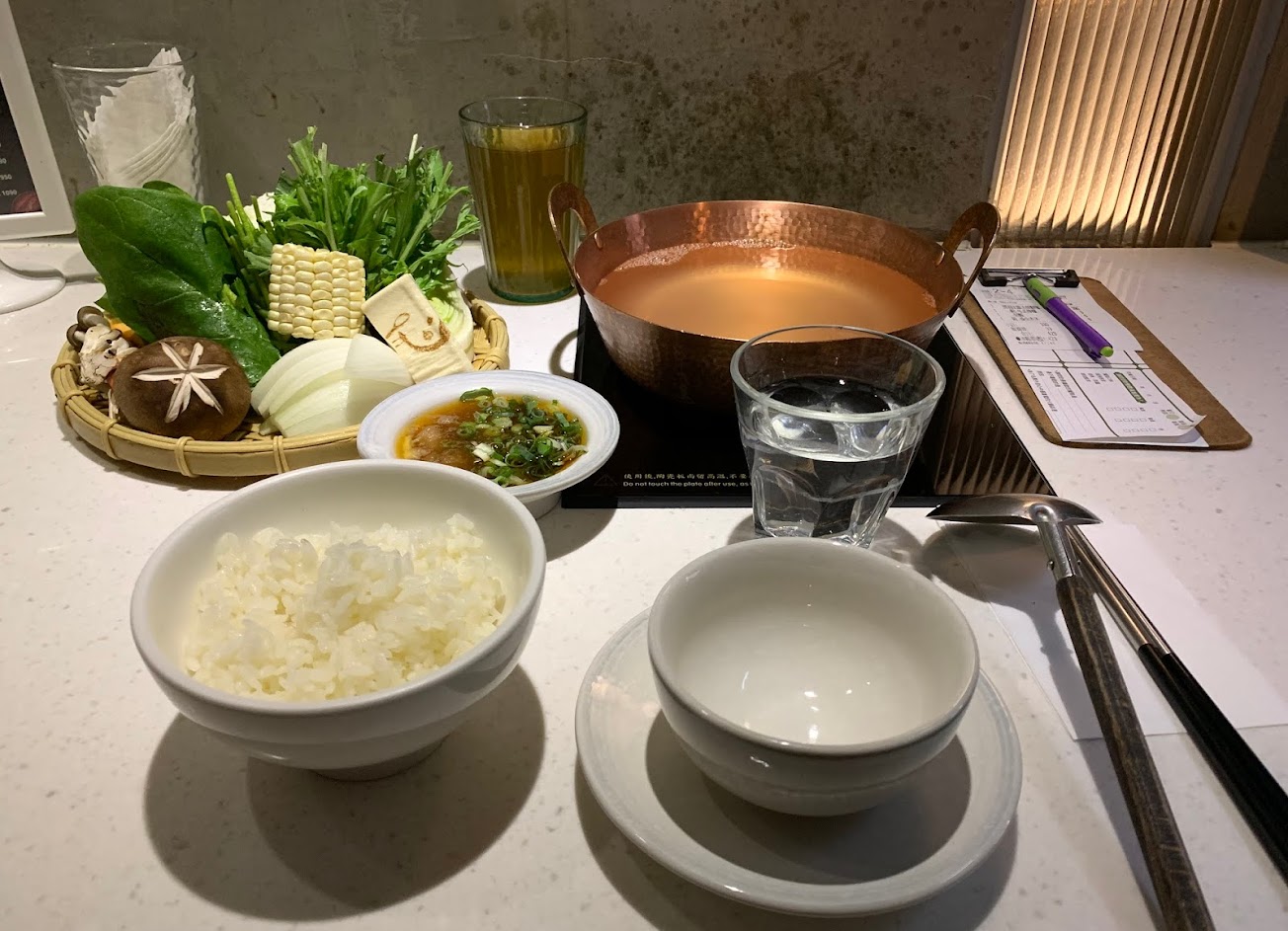湯頭超!級!清淡,鍋子感覺只有水,然後服務員會加一片昆布;相對的,附上的醬料就很夠味,吃到最後也不會太鹹。