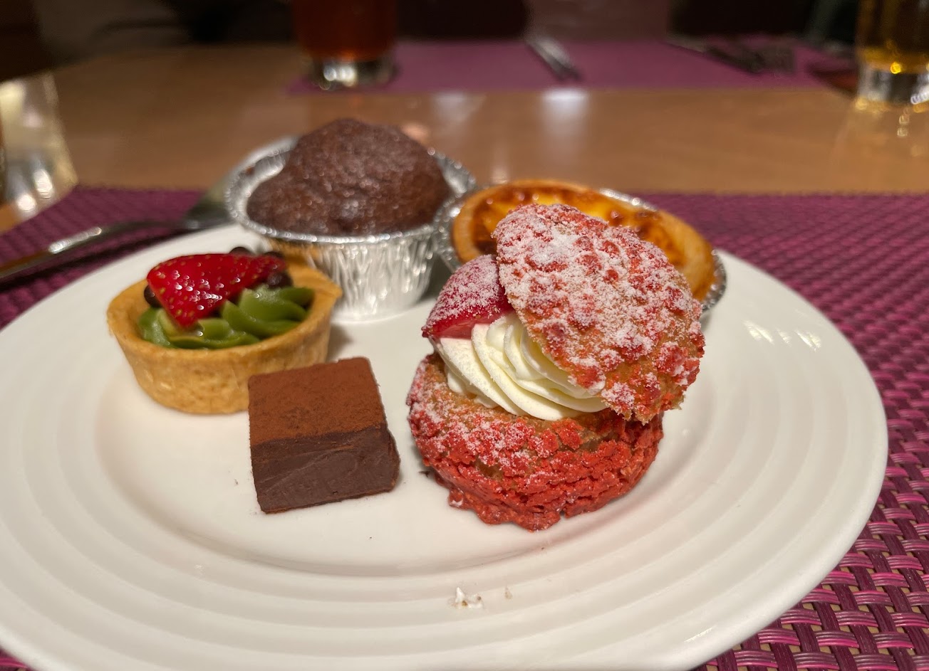 爐烤牛肉軟嫩多汁,搭配醬汁/配菜真的好好吃,甜點類獲得親友一致高評價,不僅大量使用時令草莓,還提供了自助餐少見的生巧克力,精緻得令人印象深刻,菜式烹調手法能襯托食材原味,品項多還有專人服務的特調飲料吧,誠意滿滿,服務方面現場人員皆能充分傳遞熱忱,及時整理桌面、補充物品又不至帶來壓力,主要負責接待的服務員Ruby相當親切貼心。