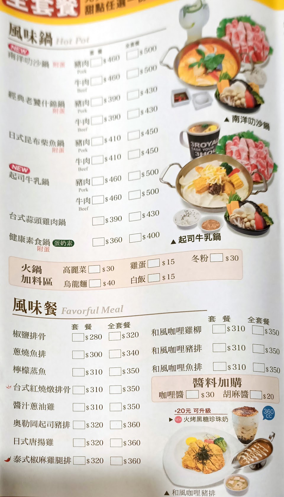 炸豆腐, 牛肉鍋, 南洋叻沙鍋 460, 爆香蛤蜊鍋, 軟炸排骨烏龍湯麵, 牛3北海道奶濃鍋, 沙茶蔥爆豬, 韓式豆腐鍋