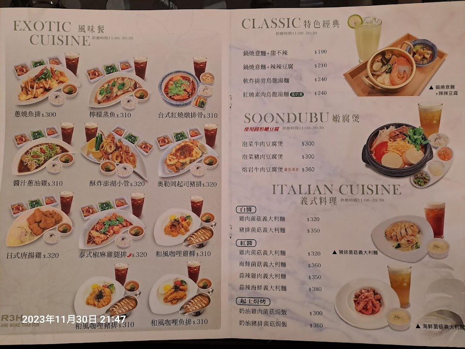 – [ ] 有火鍋,簡餐,飲品,甜點,炸物,推薦: 炸雞洋行系列、沙茶蔥爆豬鍋(可炒與加湯,湯放在玻璃瓶中,自加挺有趣),蘋橙熱紅茶附冰糖,馬卡龍
